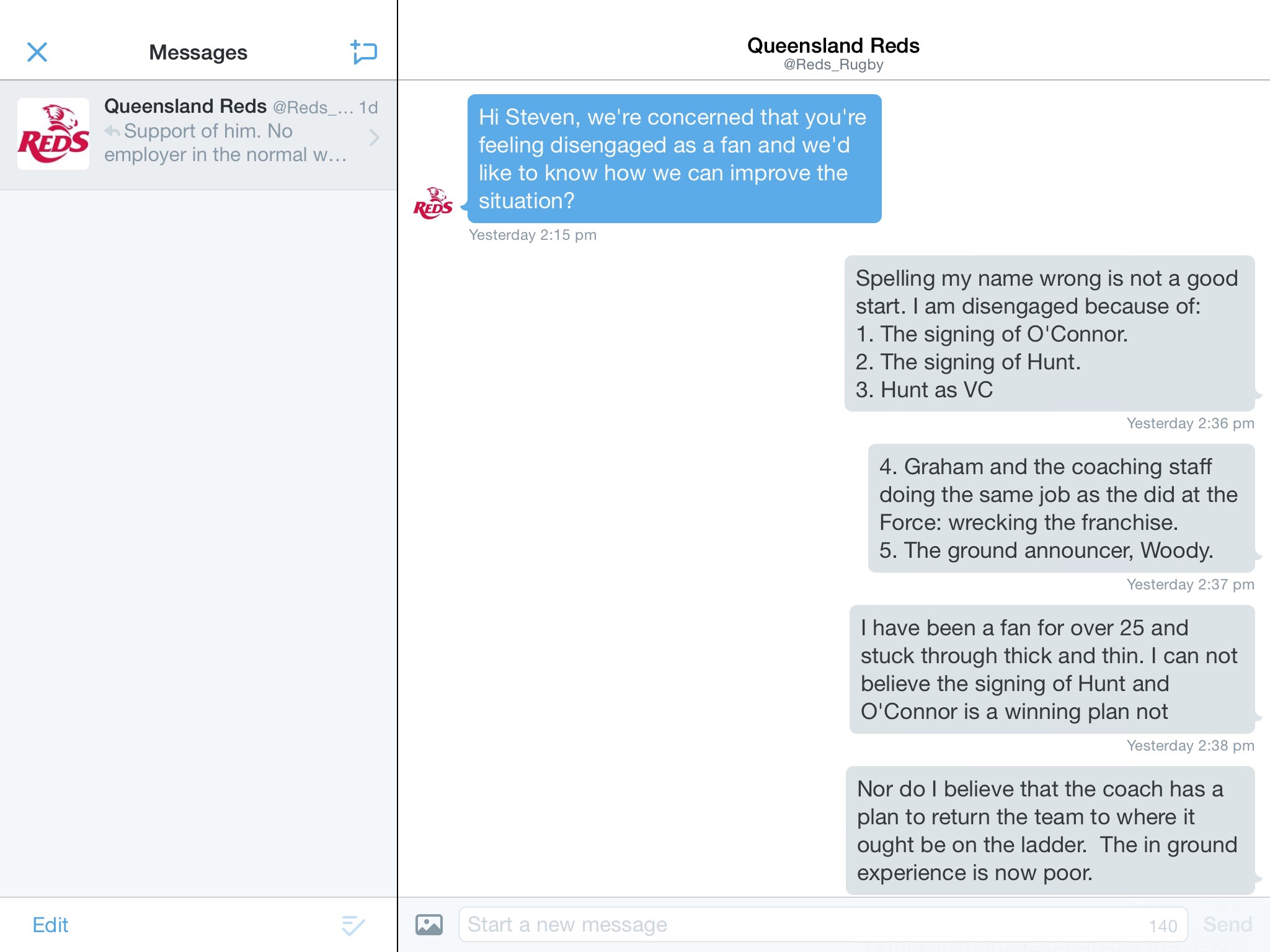 I concede that my answer did not really answer the question put to me. I set out what had led me to become disengaged without answering what would improve my level of engagement. The fact is that there is nothing that Queensland Reds could say to me that would be likely to reinvigorate my engagement levels given the breadth of my whinges.